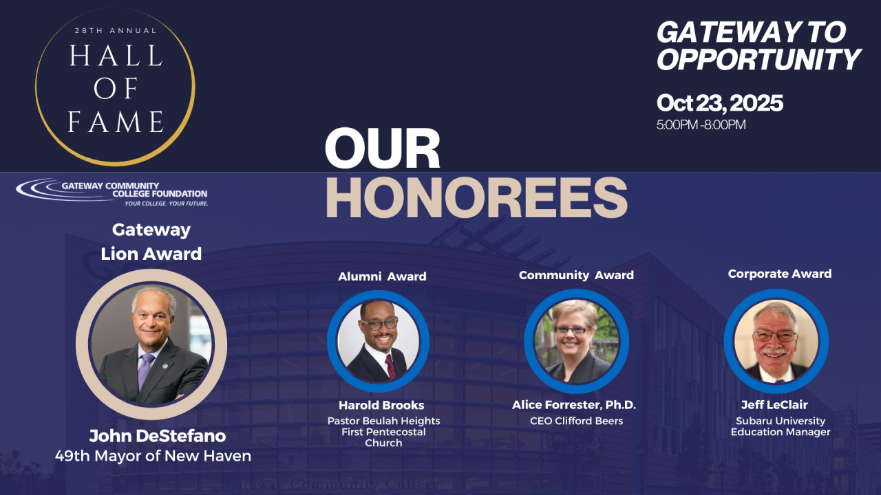Hall of Fame is the Foundation’s most ambitious annual event, and the largest private source of scholarship funds for Gateway students. More than 200 of New Haven’s corporate, nonprofit, academic, government and community leaders are expected to help celebrate the honorees. There will be delicious food; short, impactful programming; and great networking.