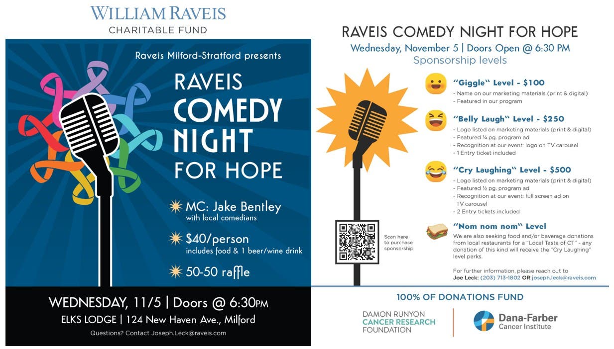 William Raveis Milford-Stratford Regional Office is hosting their 6 th Annual Raveis Comedy Night for Hope – Wednesday, November 5, 2025 at the Milford Elks Lodge, 124 New Haven Ave, Milford, CT 06460. Doors for the comedy event will open at 6:30pm. In addition to laughs provided generously by a lineup of local comedians, get a taste of Connecticut with food from fantastic local establishments from Milford and surrounding towns.