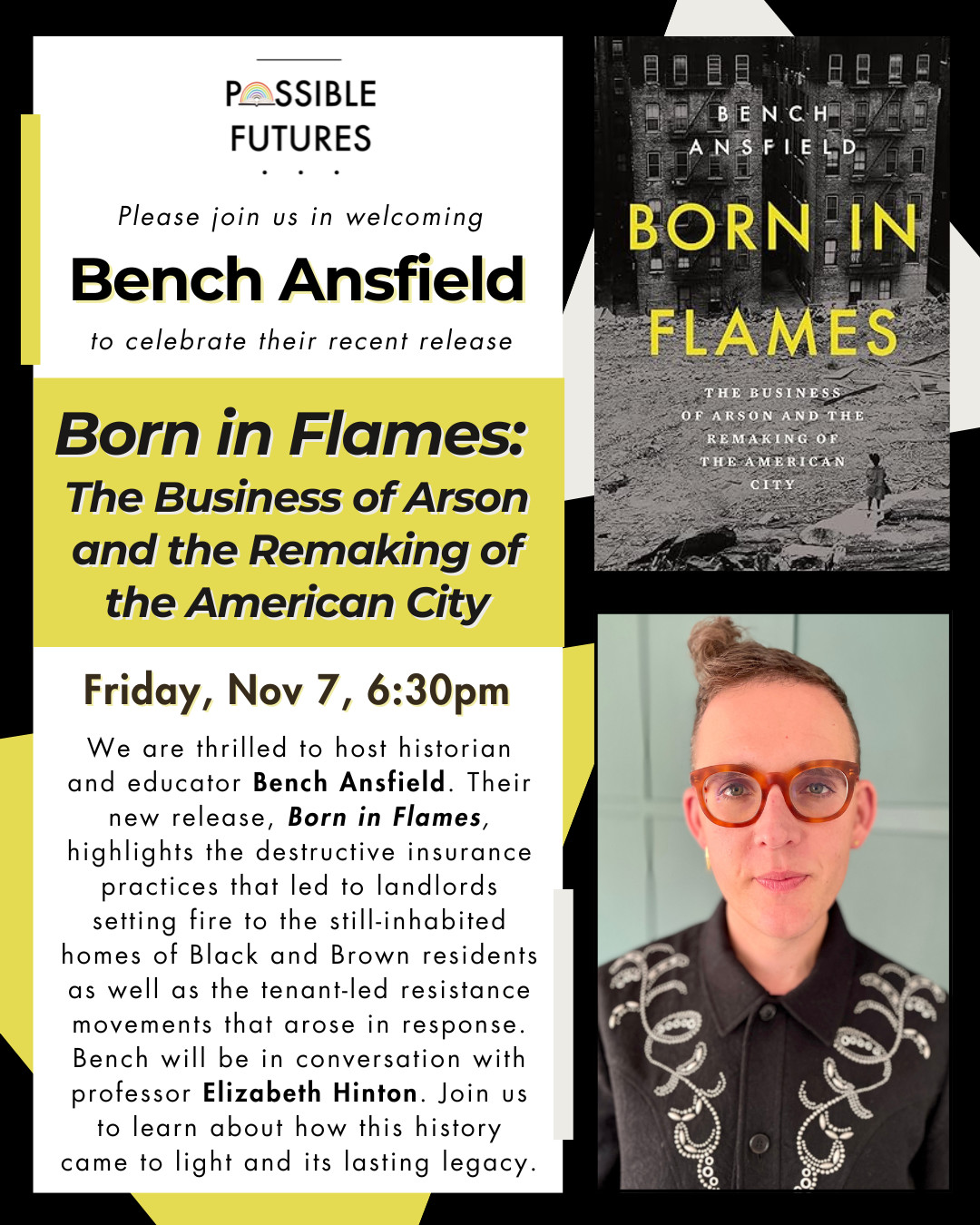 We are thrilled to host historian and educator Bench Ansfield. Their new release, Born in Flames, highlights the destructive insurance practices that led to landlords setting fire to the still-inhabited homes of Black and Brown residents as well as the tenant-led resistance movements that arose in response. Bench will be in conversation with professor Elizabeth Hinton. Join us to learn about how this history came to light and its lasting legacy.