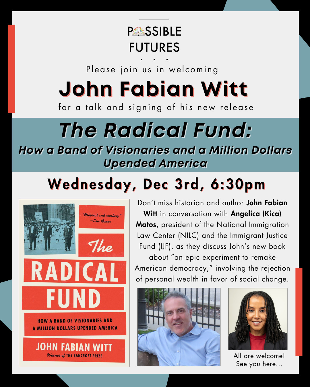 Don’t miss historian and author John Fabian Witt in conversation with Angelica (Kica) Matos, president of the National Immigration Law Center (NILC) and the Immigrant Justice Fund (IJF), as they discuss John’s new book about “an epic experiment to remake American democracy,” involving the rejection of personal wealth in favor of social change.