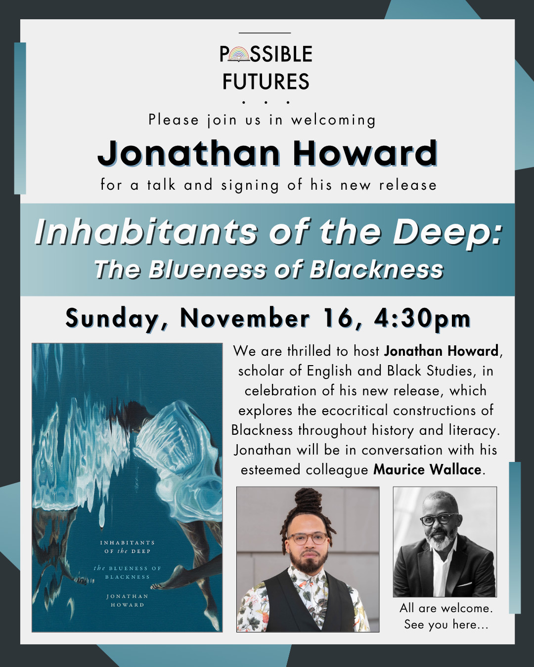We are so excited to host Dr. Jonathan Howard for a talk about his new release, Inhabitants of the Deep: The Blueness of Blackness. Jonathan will be in conversation with Professor Maurice Wallace. Join us for what promises to be a wonderful event!