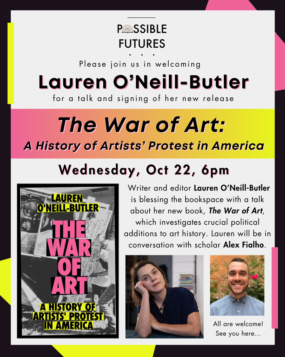Writer and editor Lauren O’Neill-Butler is blessing the bookspace with a talk about her new book, [The War of Art](https://www.possiblefuturesbooks.com/item/cQ0CGOT0rSmwgiAKXD5hQ)_, which investigates crucial political additions to art history. Lauren will be in conversation with scholar Alex Fialho.