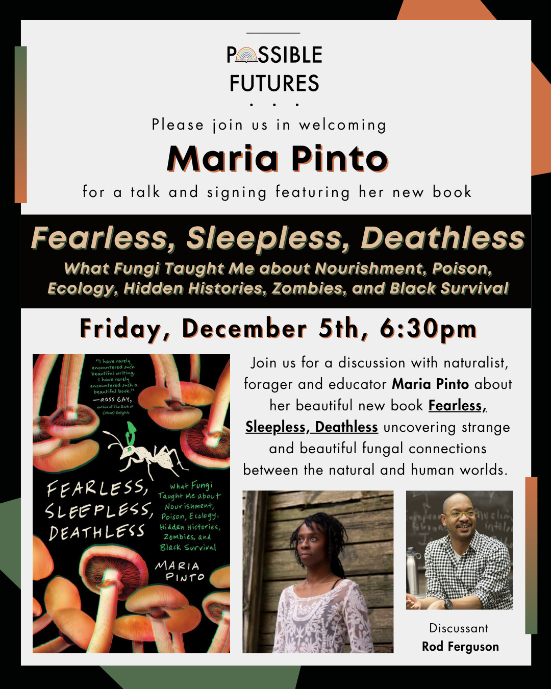 Join us for a discussion with naturalist and educator Maria Pinto about her beautiful new book, Fearless, Sleepless, Deathless: What Fungi Taught Me about Nourishment, Poison, Ecology, Hidden Histories, Zombies, and Black Survival . Maria will be in conversation with Professor Rod Ferguson.