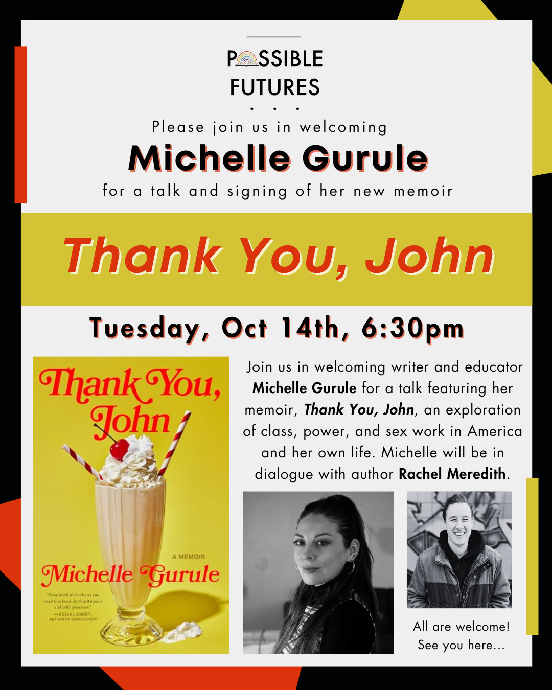 Join us in welcoming writer and educator Michelle Gurule for a talk featuring her memoir, [Thank You, John](https://www.possiblefuturesbooks.com/item/iYnmmfYY52CEAGHA2jxgA)_, an exploration of class, power, and sex work in America and her own life. Michelle will be in dialogue with local author Rachel Meredith, who recently held an event in the space for her romance novel, Girl Next Door.