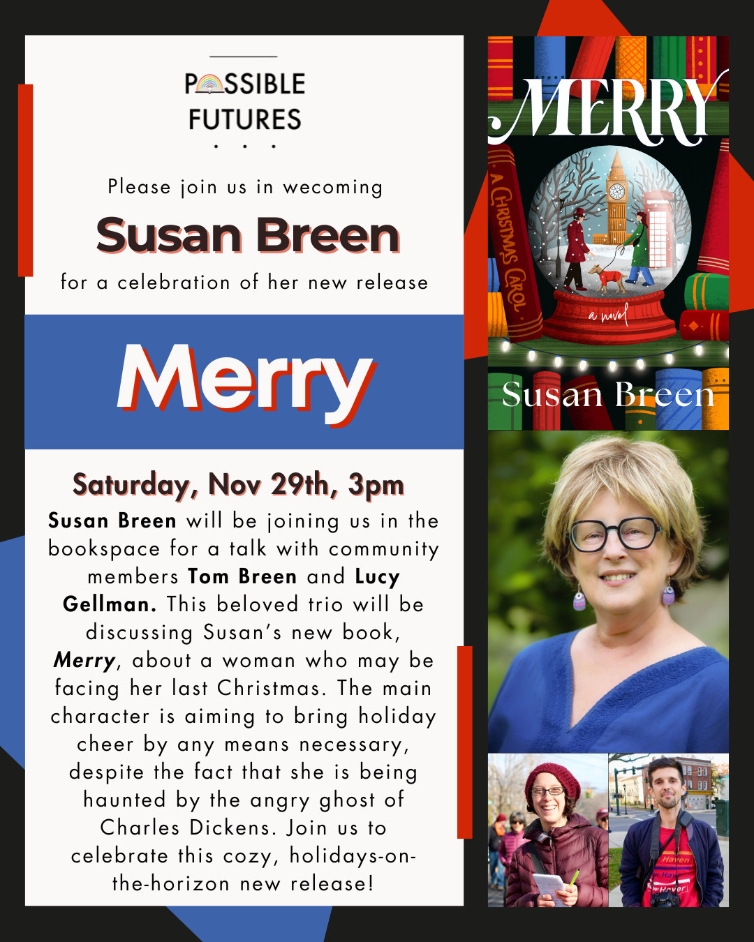 Susan Breen will be joining us in the bookspace for a talk with community members Tom Breen and Lucy Gellman. This beloved trio will be discussing Susan’s new book, Merry, about a woman who may be facing her last Christmas. The main character is aiming to bring holiday cheer by any means necessary, despite the fact that she is being haunted by the angry ghost of Charles Dickens. Join us for this sweet, cozy, holiday-on-the-horizon new release!
