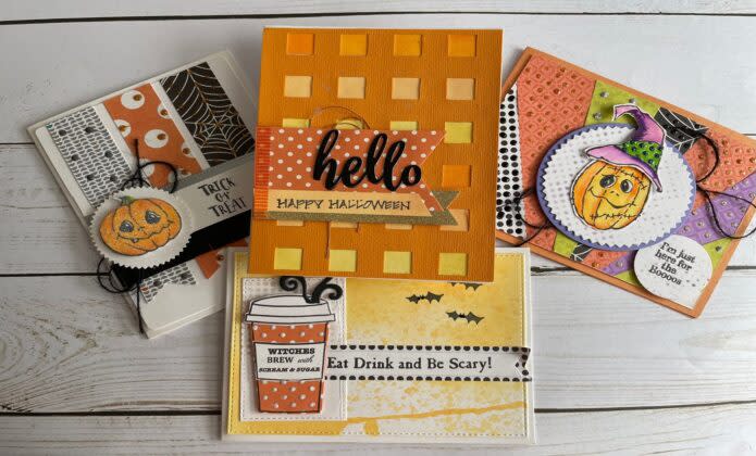 In this workshop celebrate with friends and family the mysterious but highly creative Halloween holiday by learning to craft four Halloween cards. Learn to use paper strips, ink, die cuts and explore card layout and composition. Take home a detailed instruction workshop sheet, list of supplies, information about the techniques and photos of the card/s. To make more cards at home, you will receive a kit which will include white cardstock, die cut pieces, coordinating colored cardstock and any other supplies needed to make more cards on your own. All cards made in the workshop include envelopes.