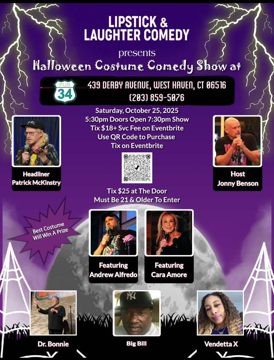Come join us for a night of spooky fun and laughter at Pub 34! Put on your best costume (cause there's gonna be a prize for the best one!) and get ready for a hilarious comedy show that will have you in stitches. Whether you're a witch, a ghost, or something in between, all costumes are welcome! The event will take place at 439 Derby Ave, so mark your calendars and get ready for a fang-tastic time. See you there!
