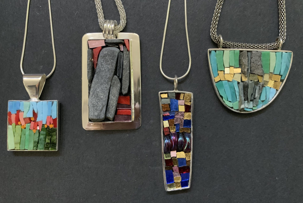 Design and create your own unique mosaic pendants using a variety of glass, stone, ceramic and other materials. Get experience in the skills of precision cutting, artistic laying techniques, and then how to adhere to a pre-made silver-plated bezel using specialized adhesives. Choose from 3 different styles of pendant – square, rectangular or oval. All tools and materials needed to complete two pendants will be provided. Perfect for a present or to keep for yourself. No prior mosaic or jewelry experience required.