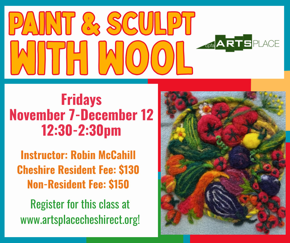 Explore the magical medium of wool and its surprisingly painterly qualities! Students will create a low relief or three-dimensional sculpture, a textured painting or tapestry using felting needles. Visit www.artsplacecheshirect.org to register!