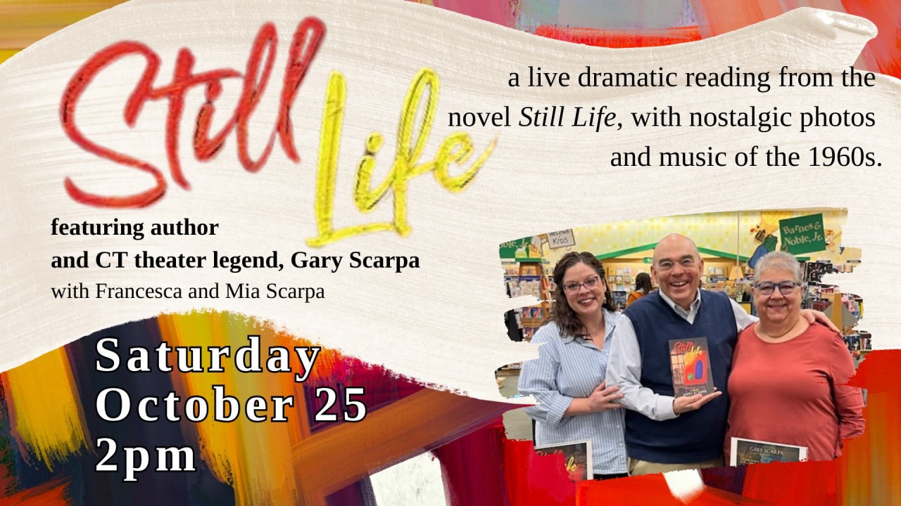 Author Gary Scarpa will present a unique 30-minute dramatic presentation, intended to introduce readers to his latest novel, STILL LIFE. The program will feature Gary, along with his wife and daughter, acting out scenes from the novel, accompanied by nostalgic photos and music of the late 1960's.