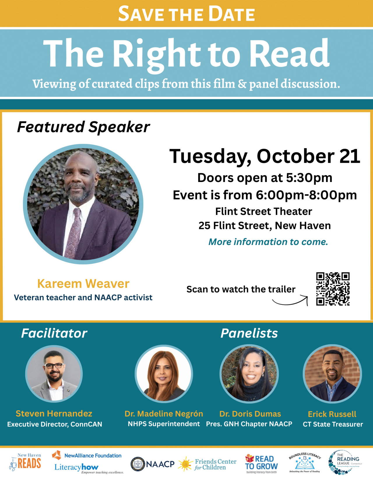 Flint Street Theater at Friends Center for Children is hosting a panel discussion and a screening of curated clips from the film The Right to Read. Join us on Tuesday, October 21st, from 5:30–8:00 PM for a conversation with featured speakers Erick Russell (CT State Treasurer), Kareem Weaver (veteran teacher and NAACP activist), Steven Hernandez (ConnCAN Executive Director), Dr. Madeline Negrón (NHPS Superintendent), and Dr. Doris Dumas (President, GNH NAACP). The event is free and open to all.