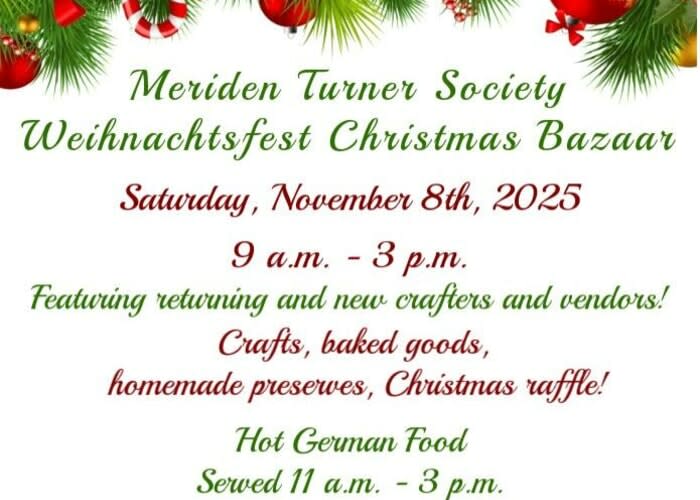 The Meriden Turner Society will be hosting their annual Weihnachtsfest Christmas Bazaar on Sat, Nov 8, 2025 from 9:00 am to 3:00 pm. This year's event will feature new and returning Crafters/Vendors, homemade preserves and baked goods and a Christmas Raffle. German food will be served from 11:00 am to 3:00 pm. Visit us at the Meriden Turner Halle (800 Old Colony Rd, Meriden) and kick-off your holidays with a cup of Glühwein while shopping for the special people on your list. For more information, please visit our website at http://meridenturnersociety.com/index.php?EventID=Weihnachtsfest+Christmas+Bazaar or on facebook at https://www.facebook.com/events/1432796064697702.